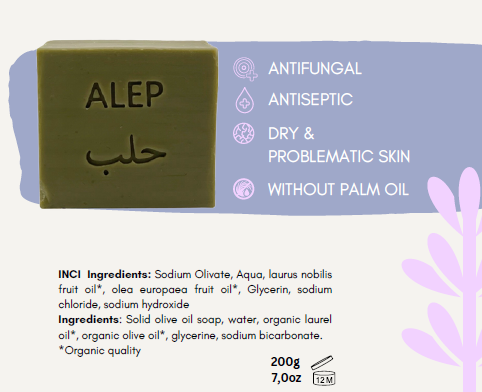 Diese Harmonie & Provence-Seife wird nach dem über 3000 Jahre alten Originalrezept hergestellt, welches die Marseiller Seife geerbt hat: Olivenöl, Lorbeeröl, Wasser und Natron. Die Seife ist nach der syrischen Stadt benannt, in der sie zuerst hergestellt wurde: Aleppo. Sie war die erste feste Seife, die jemals produziert wurde. Aus natürlichen Inhaltsstoffen hergestellt, ist diese Seife umweltfreundlich und biologisch abbaubar. Der Duft und die Farbe der Seife sind natürlichen Ursprungs.
