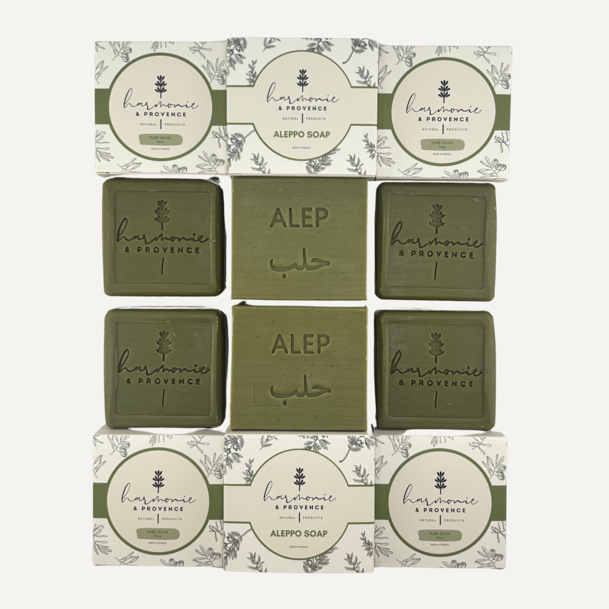 - Hergestellt in Frankreich: 6 Seifen im 100g & 200g-Format, 4 Reine Oliven-Seife und 2 Alep Seife