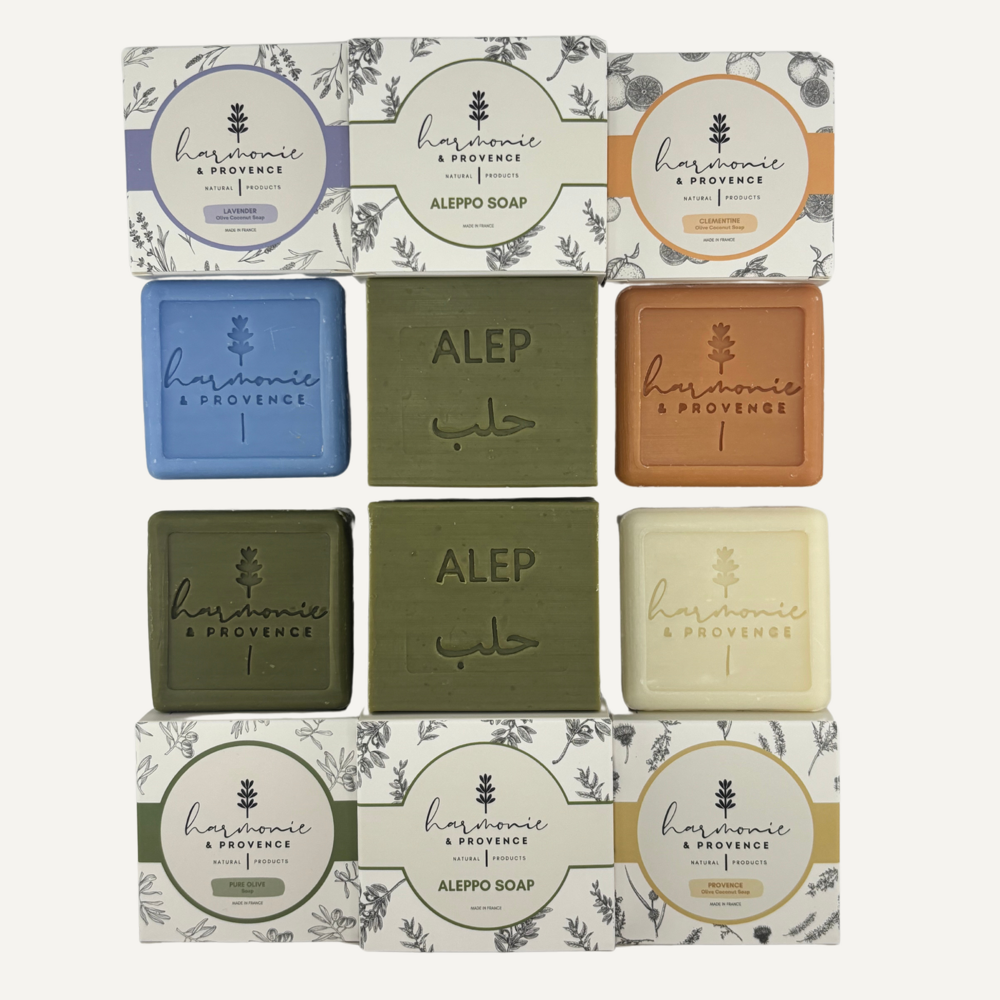 - Hergestellt in Frankreich: 6 Seifen im 100g & 200g-Format, 1 Clementinen-Seife, 1 Lavandin-Seife, 1 Provence-Seife, 1 Reine Oliven-Seife und 2 Alep Seife